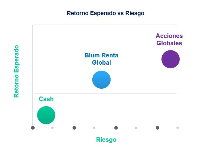 En el cuadro de riesgo vs. retorno, Blum Renta Global se ubica en el medio. Su objetivo de retorno es mayor que los depósitos, para lo cual estará expuesto a activos de riesgo; pero esos activos no serán tan riesgosos como las acciones.